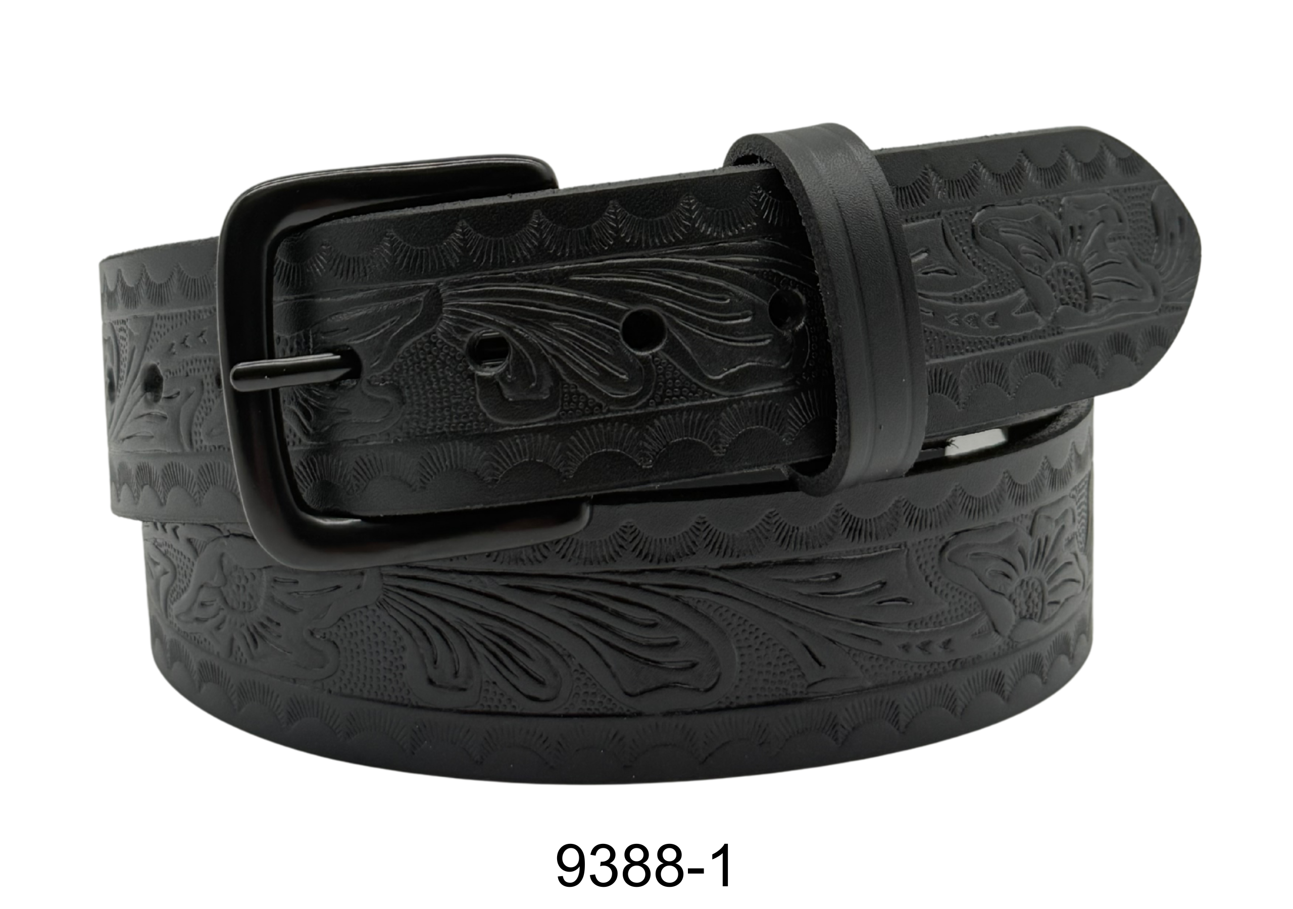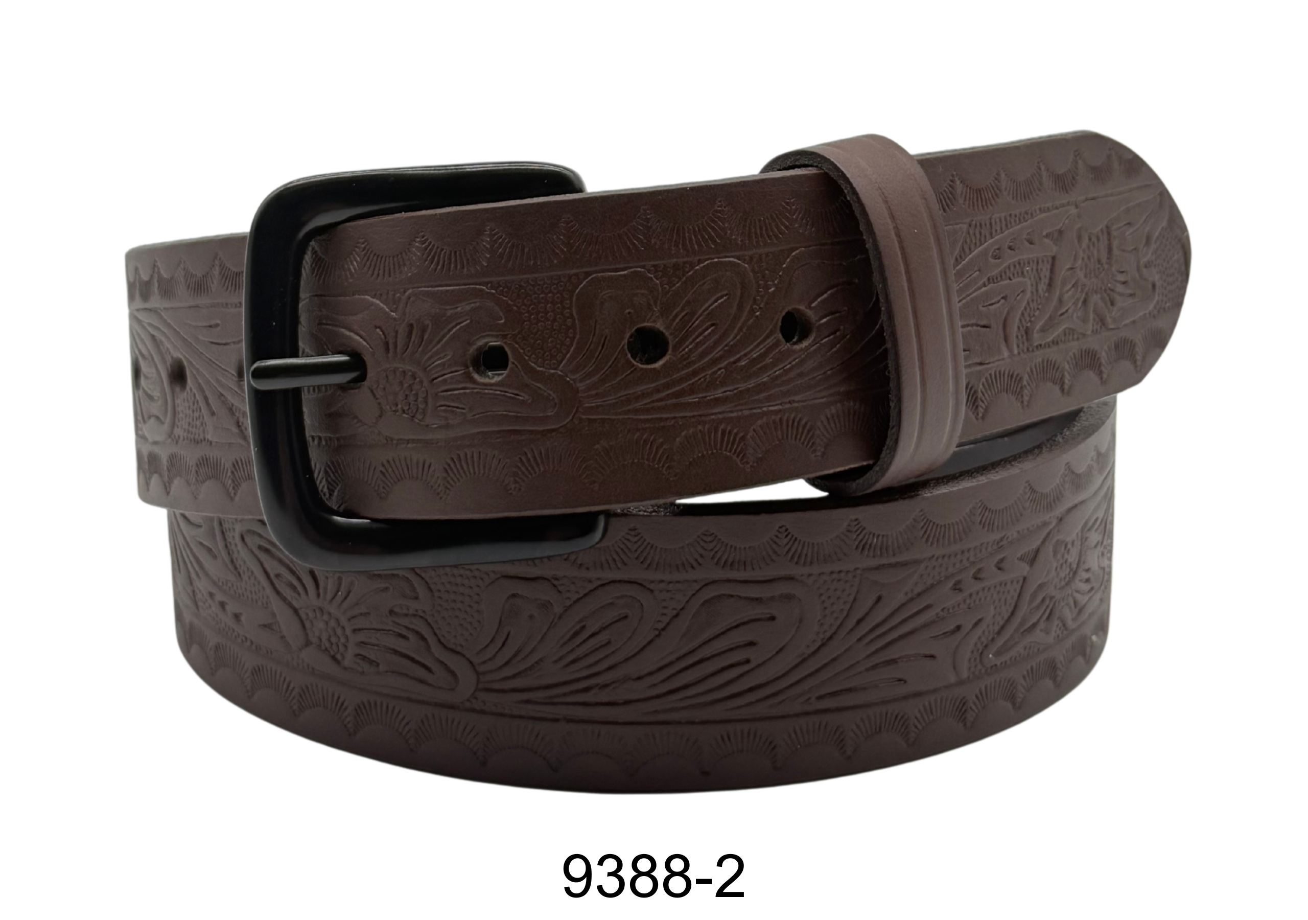 9388 is a floral embossed jean belt designed to add character to any casual outfit. Featuring a detailed embossed pattern and snap construction for easy buckle changes, it combines style with everyday durability. Finished with a black nickel buckle, this belt is a standout accessory for denim and casual wear.